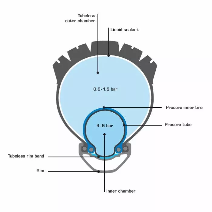 Two special Procore components form the inner high-pressure chamber: the special Procore tube and the Procore inner tyre. This “core” is extremely high-pressure stable and at the same time very light.